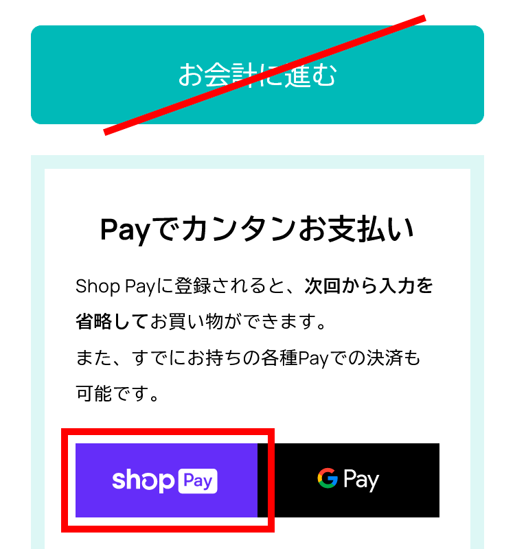 1)お会計の際に「お会計に進む」ボタンではなく、「Shop Pay」ボタンをクリック。