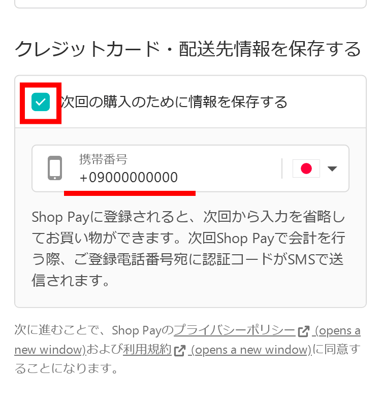 お会計時に「クレジットカード・配送先情報を保存する」にチェックを入れて、お使いの携帯電話番号を入力するだけです。