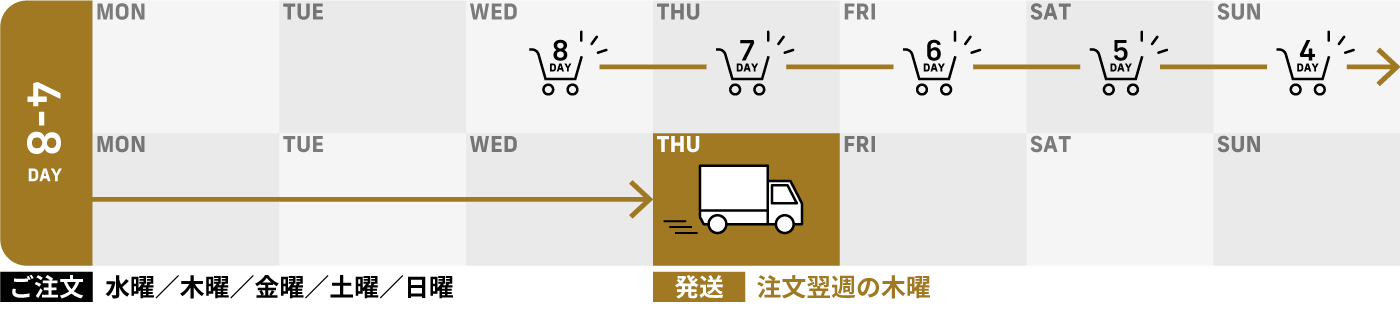 お届けにかかる日数は2日~8日と、ご注文いただいたタイミングによって異なりますので、予めご了承ください。
