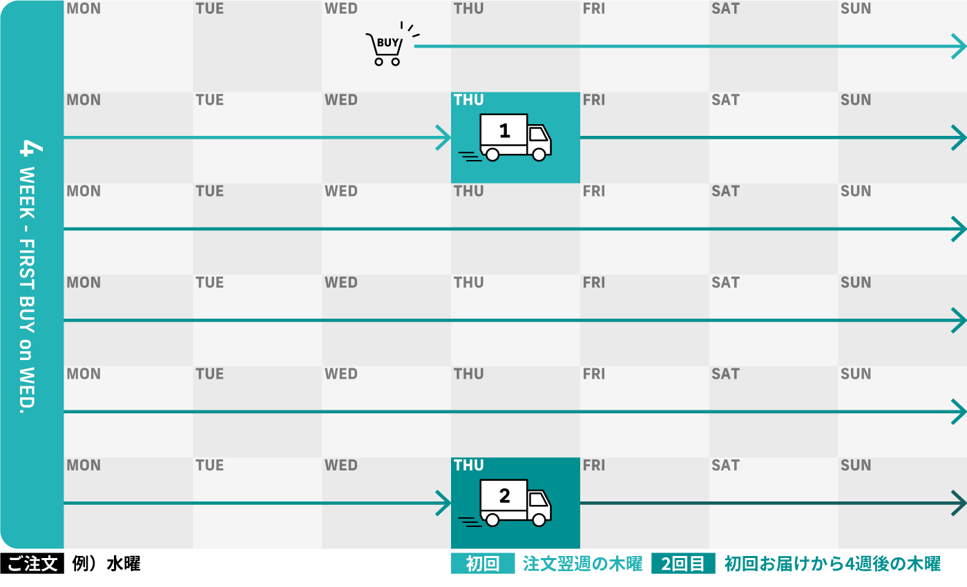 二回目以降のお届けは、初回お届け日から2週間後、4週間後など、選択いただいたサイクルのうち、もっとも近い木曜に発送いたします。